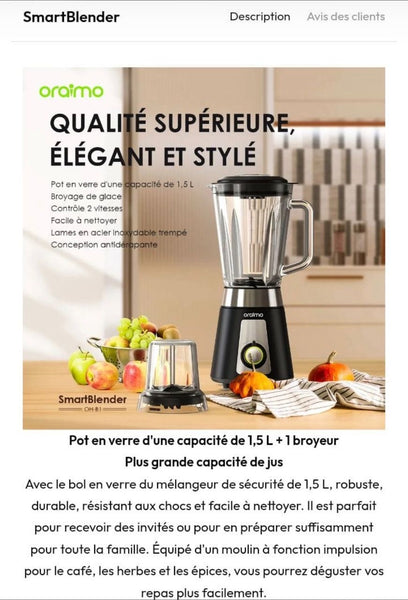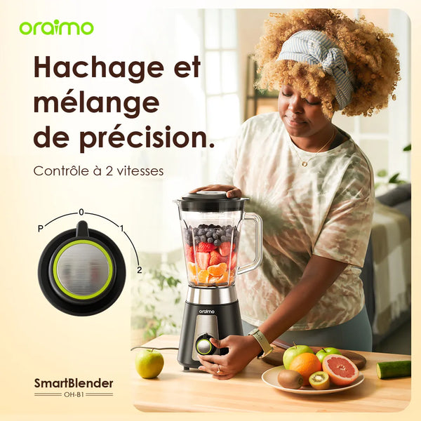 Le *SmartBlender Oraimo OH-B1* est un mélangeur de haute qualité, élégant et stylé, conçu pour répondre à vos besoins en cuisine. Il combine performance et design moderne pour s'intégrer parfaitement dans votre espace de travail.